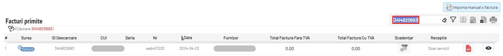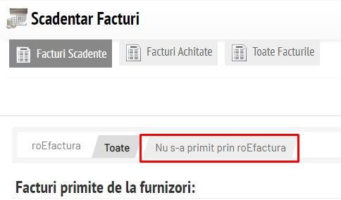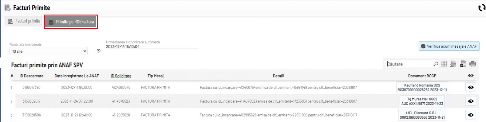 Primite pe RO e-Factura - sunt listate facturile primite de pe RO e-factura