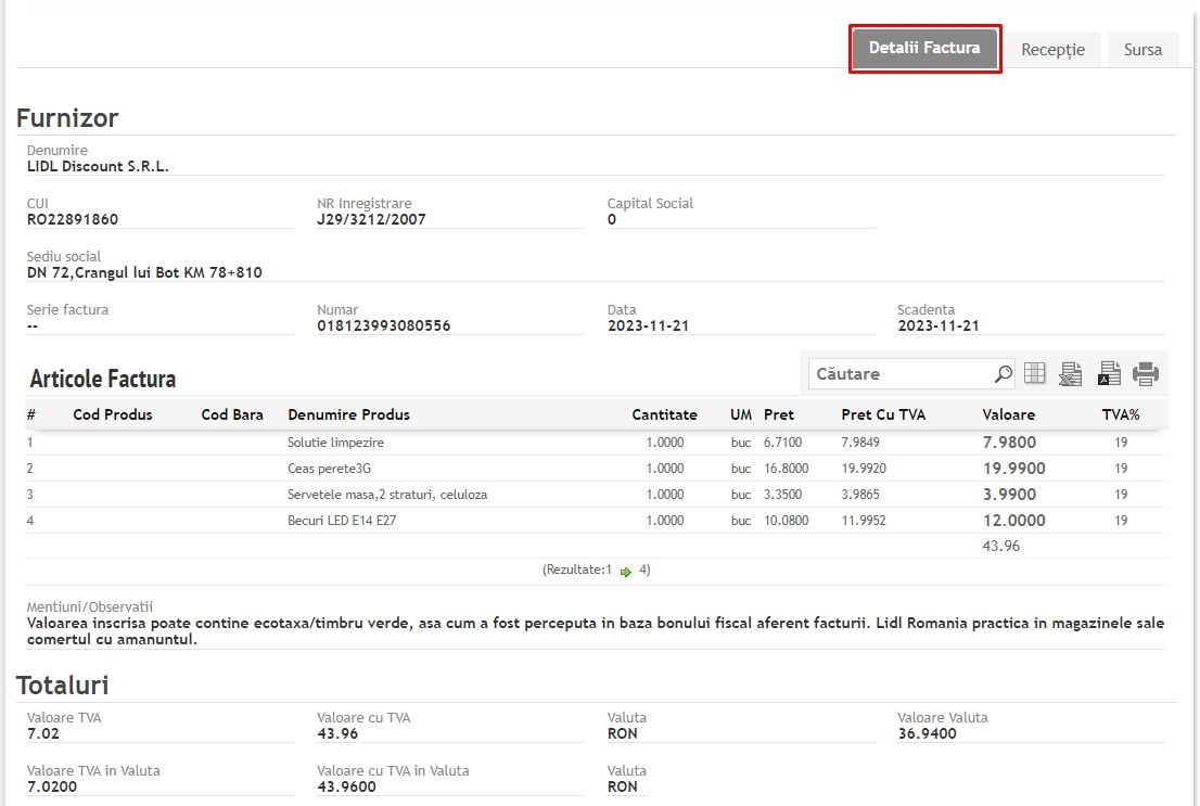 1. Tab-ul Detalii Factura - aici se pot vizualiza datele primite.