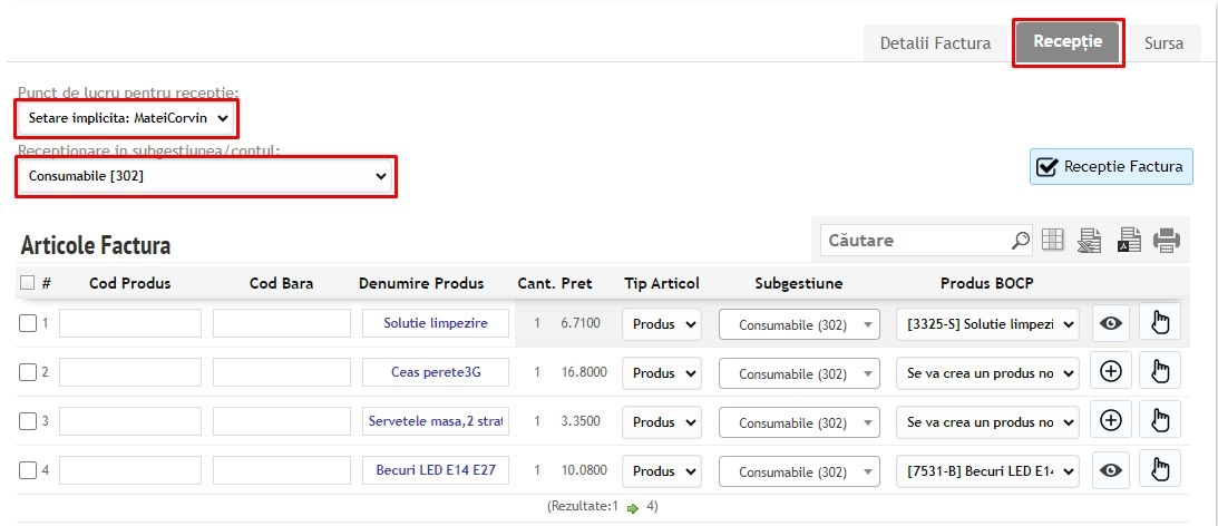 2. Tab-ul Recepție - aici avem posibilitatea de a recepționa produsele de pe factură.