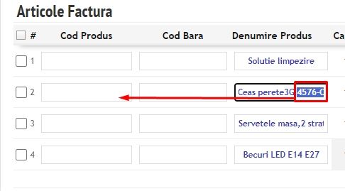 Există cazuri când furnizorul completează codul produsului în fața sau după denumirea acestuia, în acest caz se poate tăia (cut) codul respectiv din câmpul denumirii și se poate lipi în câmpul destinat.