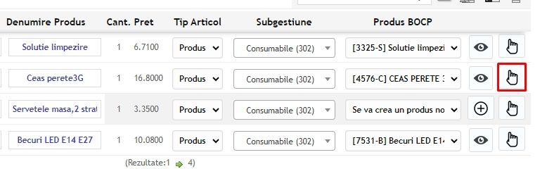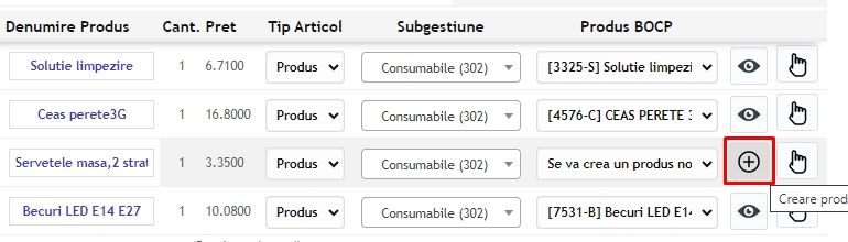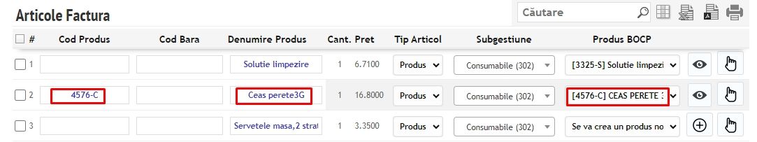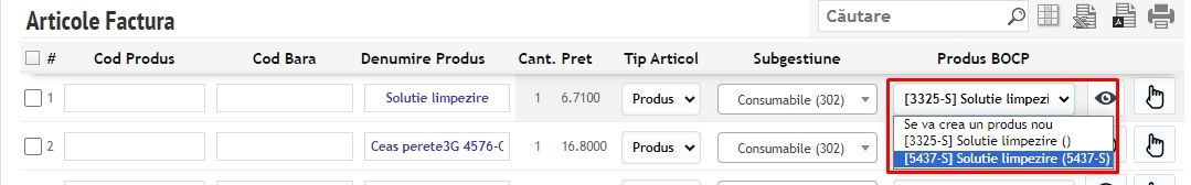 După informațiile citite de pe factură, sistemul BOCP® - CloudSales mapează produsele din baza de date, dacă găsește, câmpul "Produs BOCP" va fi completat automat cu produsul găsit. Dacă sunt mai multe produse cu denumirea respectivă, se poate selecta care se dorește.