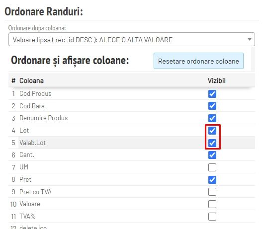 Se selectează opțiunea de vizibilitate coloane, se bifează opțiunile "Lot" și "Valab.Lot".