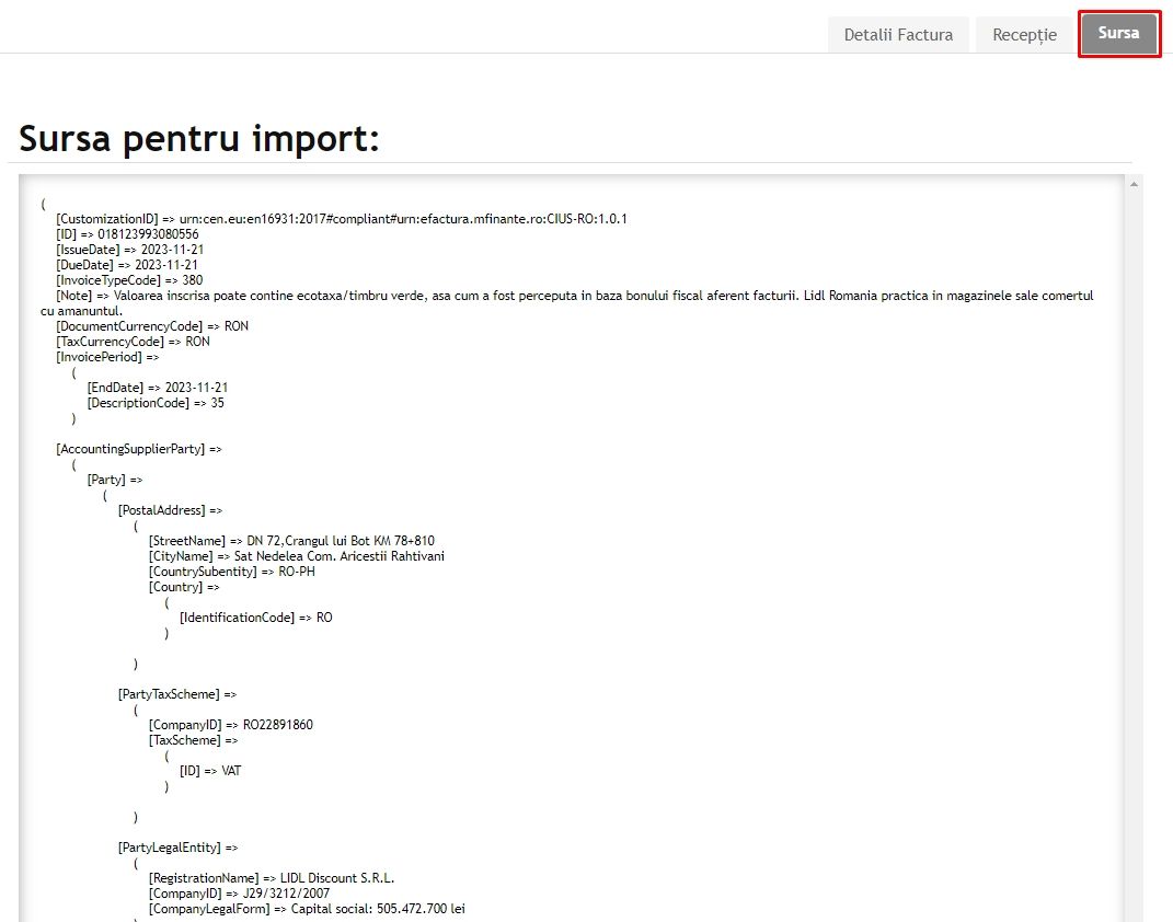 3. Tab-ul Sursa - aici se poate vizualiza sursa de importare, se pot consulta și observa datele primite.