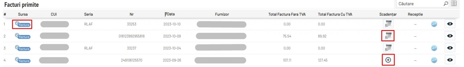 În coloana Sursa este afișată o iconiță cu sursa facturii: