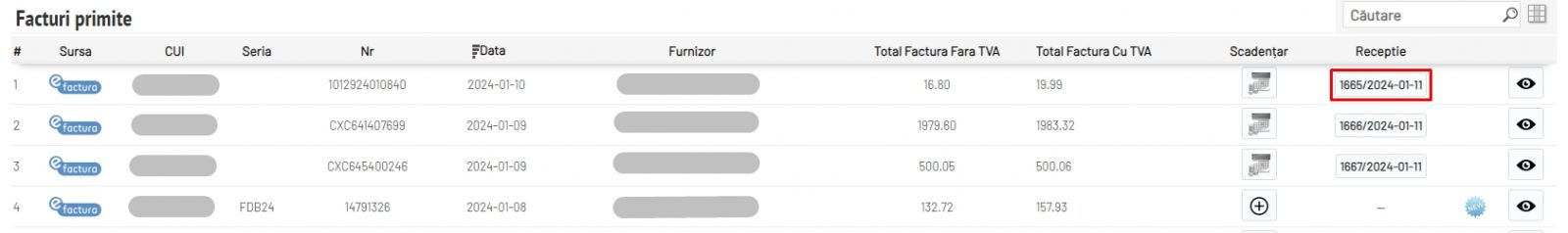 Se autodetectează dacă există deja recepție pentru acel nr. de factură, dată și CUI, și se marchează factura primită ca recepționată. Recepțiile se pot vizualiza printr-un click pe numărul recepției în coloana Receptie.