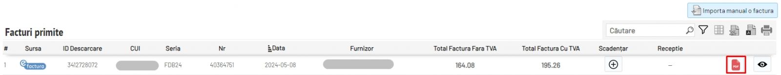 și se poate descărca rapid în format PDF prin iconița destinată în dreptul fiecărei facturi primite.