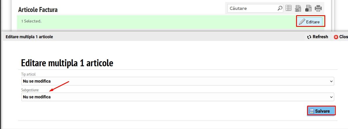 Dacă sunt mai multe produse pentru care se dorește schimbarea subgestiunii, se bifează acele produse, apoi se apasă butonul Editare și se setează subgestiunea dorită