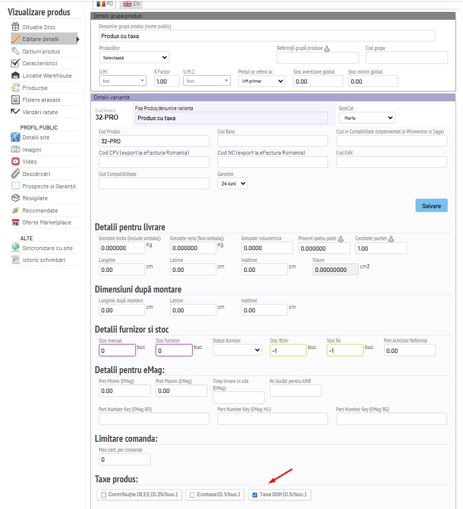 Produsele pentru care se dorește facturarea automată a taxei pot fi configurate accesând fișa de produs, tab-ul Editare detalii: