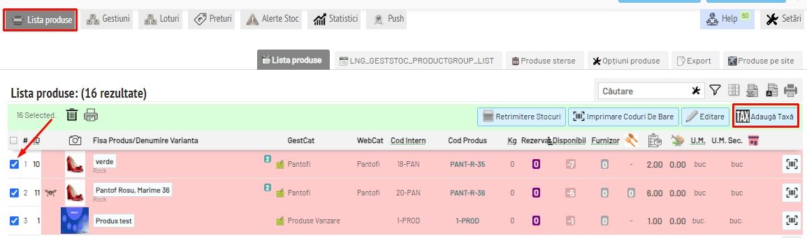 Opțional se pot adăuga taxe la mai multe produse deodată sau se pot elimina dintr-o anumită taxă, selectând produsele din Gestiune- Gestiune stoc- Listă produse- Adaugă Taxă: