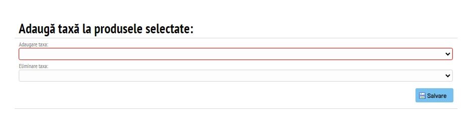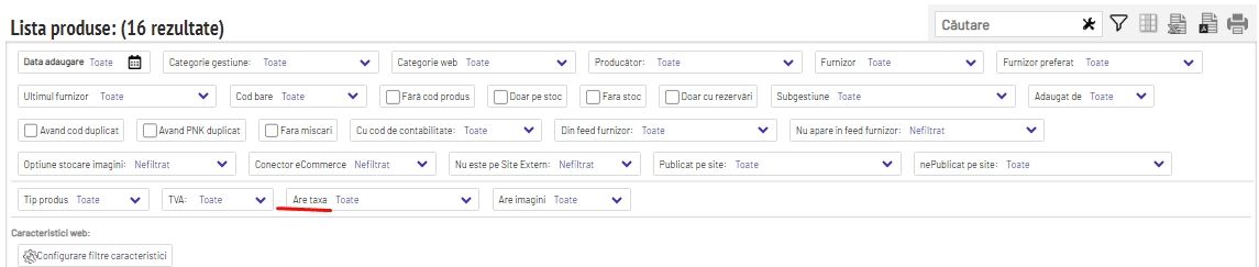 Pe lista de produse, de la Filtrare rezultate se poate filtra după produsele care au o anumită taxă, iar acele produse se pot adăuga în altă categorie de taxe sau elimina din altă categorie de taxă