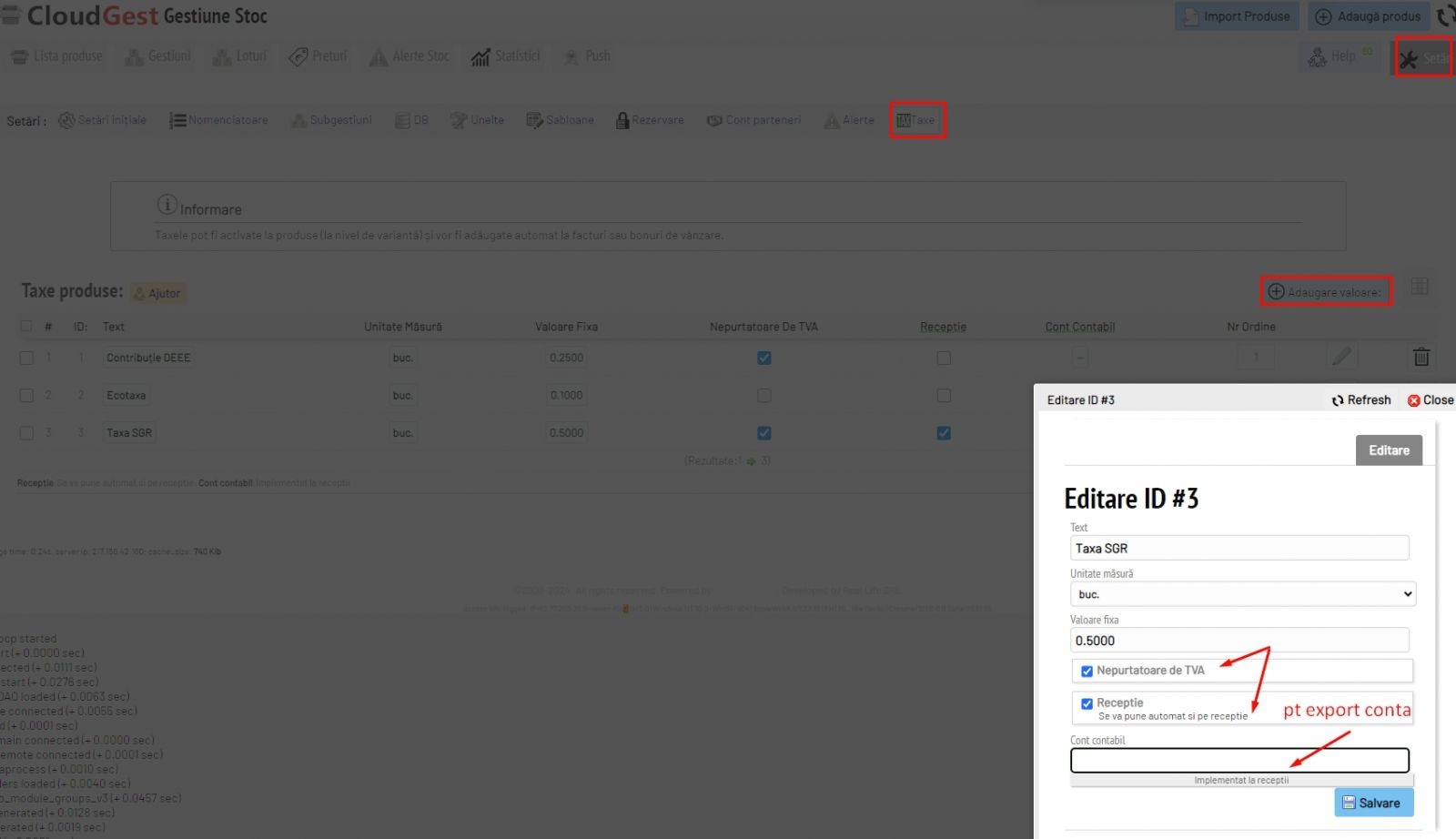 Aici apar toate taxele definite și se pot bifa pentru fiecare produs la care se aplică.