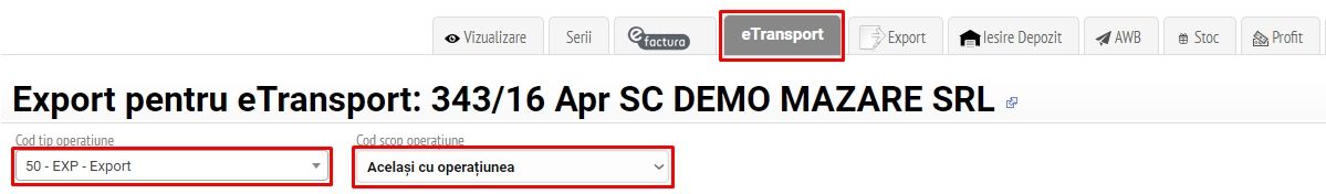 Se accesează factura dorită și sub tab-ul eTransport se completează datele necesare referitoare la livrare.