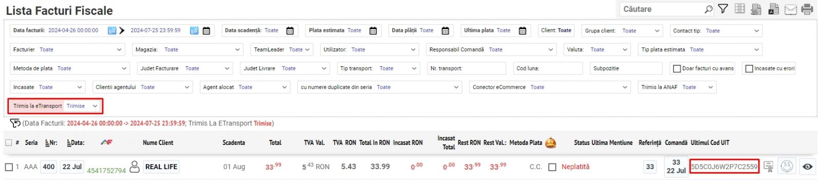 afișarea coloanei Ultimul cod UIT, totodată se poate seta filtrul Trimis la eTransport la valorile Trimise, Netrimise, se afișează și ID-ul de încărcare eTransport în coloana Număr de încărcare eFactura/eTransport RO.