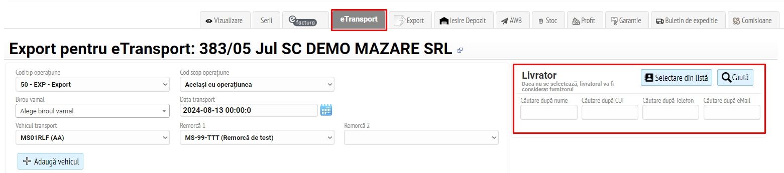 În cazul în care livratorul este o altă companie, se poate selecta din Agenda de contacte completând codul fiscal al acestuia în câmpul codului fiscal al transportatorului. Dacă nu se selectează un livrator, atunci implicit codul fiscal al transportatorului se va considera furnizorul emitent al facturii.