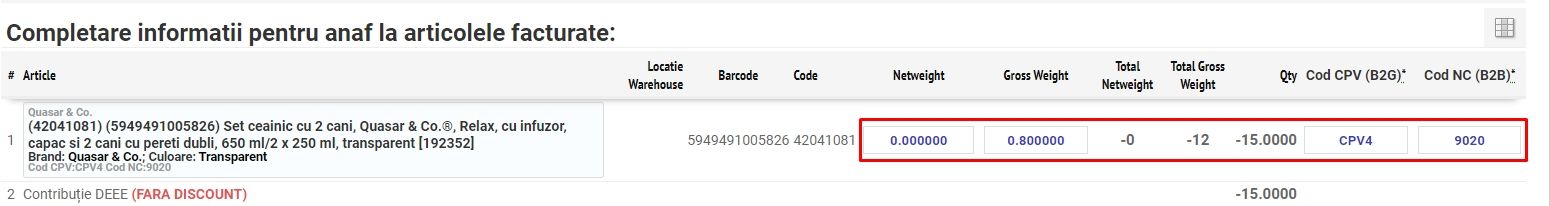 Dacă trebuie modificate/completate datele produselor pentru trimitere, în partea de jos al paginii se pot modifica greutățile și codurile NC pentru fiecare linie în parte.