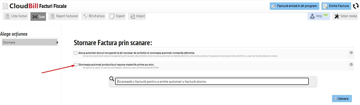 Cazul 3. Se scanează o factură fiscală prin tab-ul Stornare. (în acest caz setarea trebuie bifată înainte de scanare)