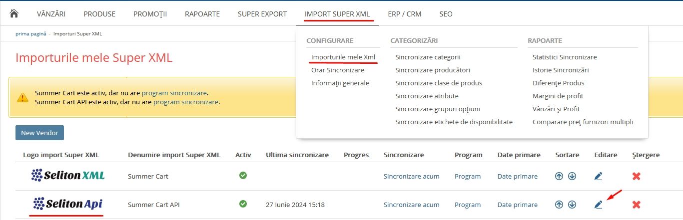 Acest feed se configurează accesând meniul Integrări - Conector eCommerce și se apasă butonul +Conectează un nou site, apoi se selectează din listă Seliton și se completează domeniu site, utilizator API și cheia secretă API, care se obțin din interfața de admin a site-ului, secțiunea Import super XML- Configurare- Importurile mele XML- Seliton API- iconița de editare.