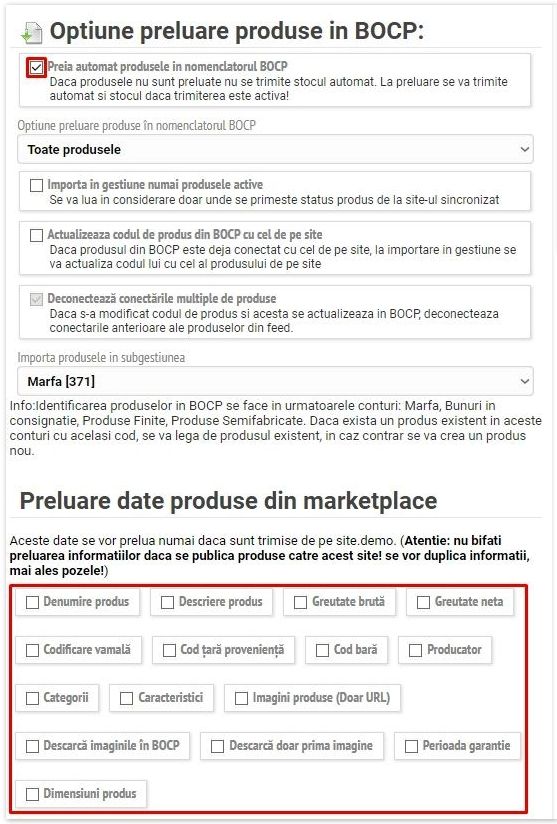 - se bifează să se preia produsele în nomenclatorul BOCP și ce date se doresc să se preia.