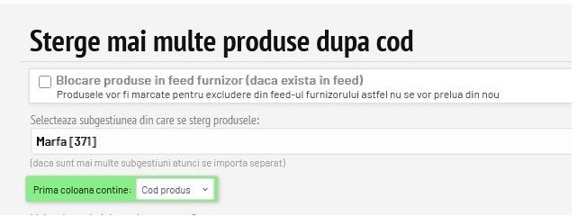 De asemenea se pot bloca produsele în feed furnizor la ștergere multiplă după cod (Gestiune - Gestiune stoc - Import produse - Ștergere după listă.