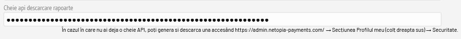 Cheia api se genereaza in contul Netopia, accesând https://admin.netopia-payments.com/ → Secțiunea Profilul meu (colț dreapta sus) → Securitate.
