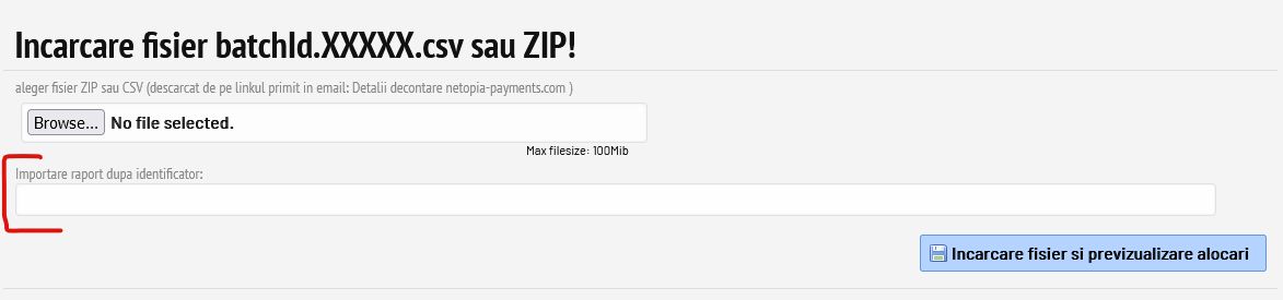În formularul pentru import se poate alege fișierul ZIP primit prin email sau se poate folosi doar id-ul raportului pentru descărcare prin API.