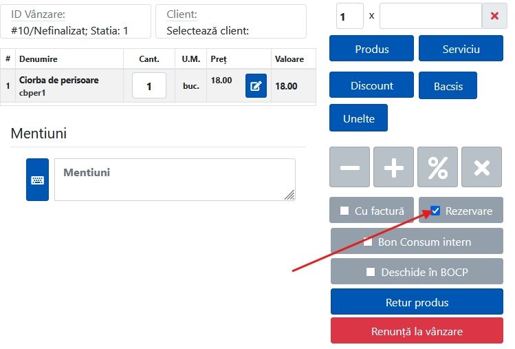După ce au fost adăugate produsele se bifează opțiunea de Rezervare (Atenție! Opțiunea trebuie bifată înainte de a închide bonul altfel se va genera un bon fiscal)